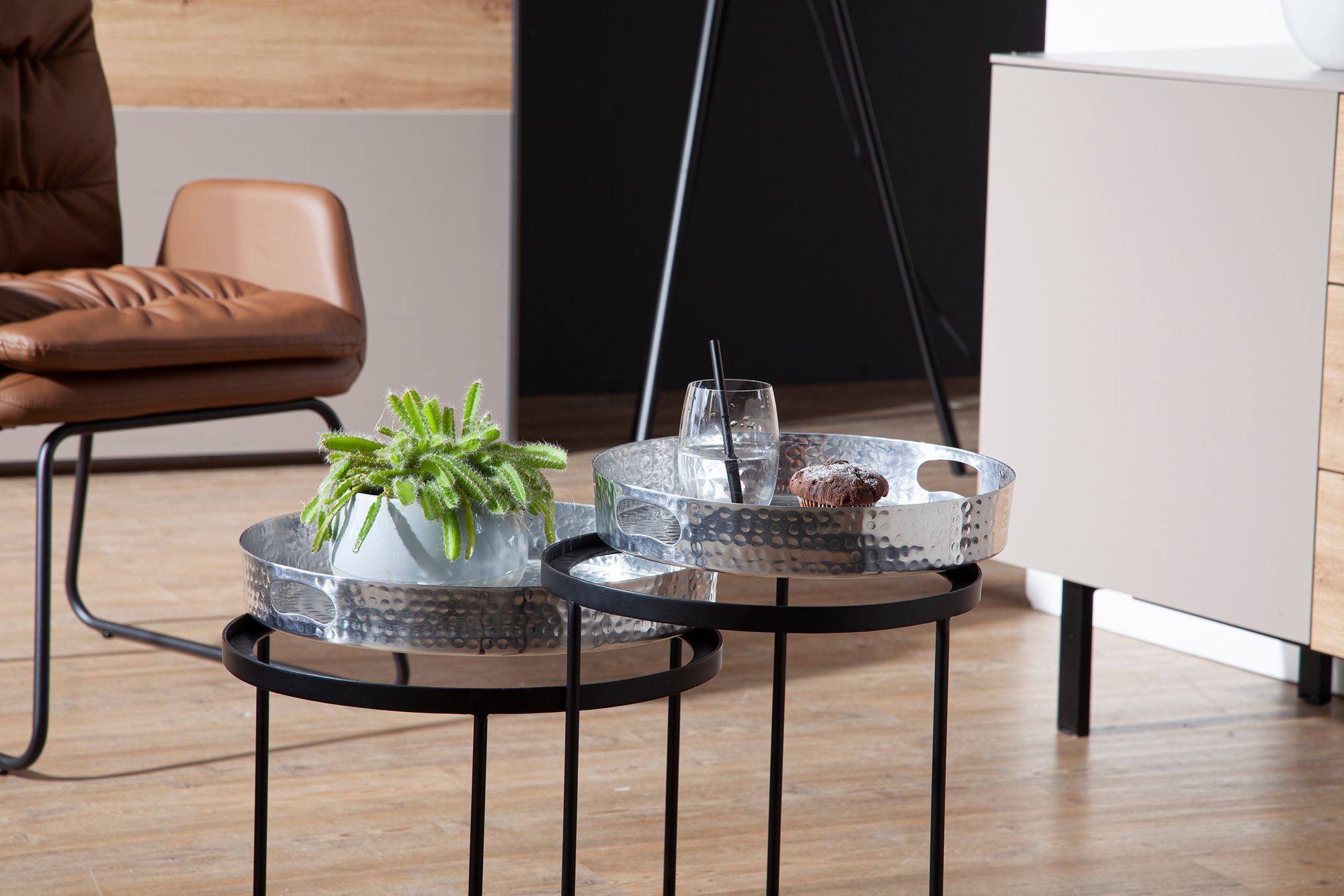 Přidejte moderní a elegantní akcent s touto sadou 2 kulatých odkládacích stolků ve stříbrné a černé barvě. Stříbrné lakované hliníkové desky mají výraznou kladívkovou strukturu, která vytváří jedinečný současný design. Robustní konstrukce z černé oceli zajišťují dlouhou životnost a pevnost.