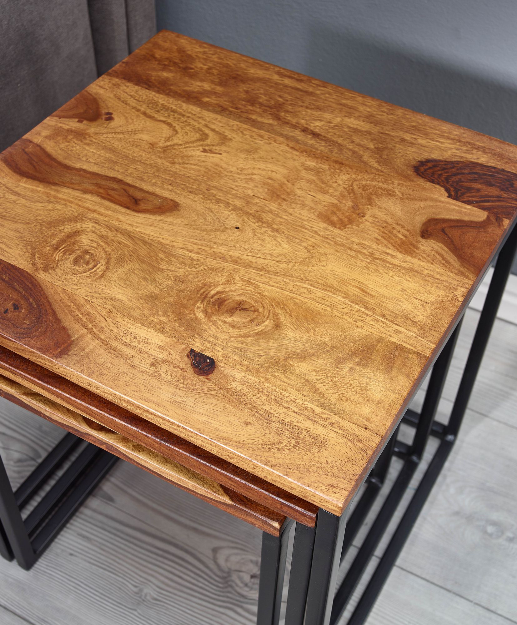 Tato sada tří hnědých odkládacích stolků z masivního dřeva Sheesham a matného černého kovu přinese do vašeho obýváku moderní a praktický prvek. Každý stolek má výraznou kresbu dřeva a pevný kovový rám.