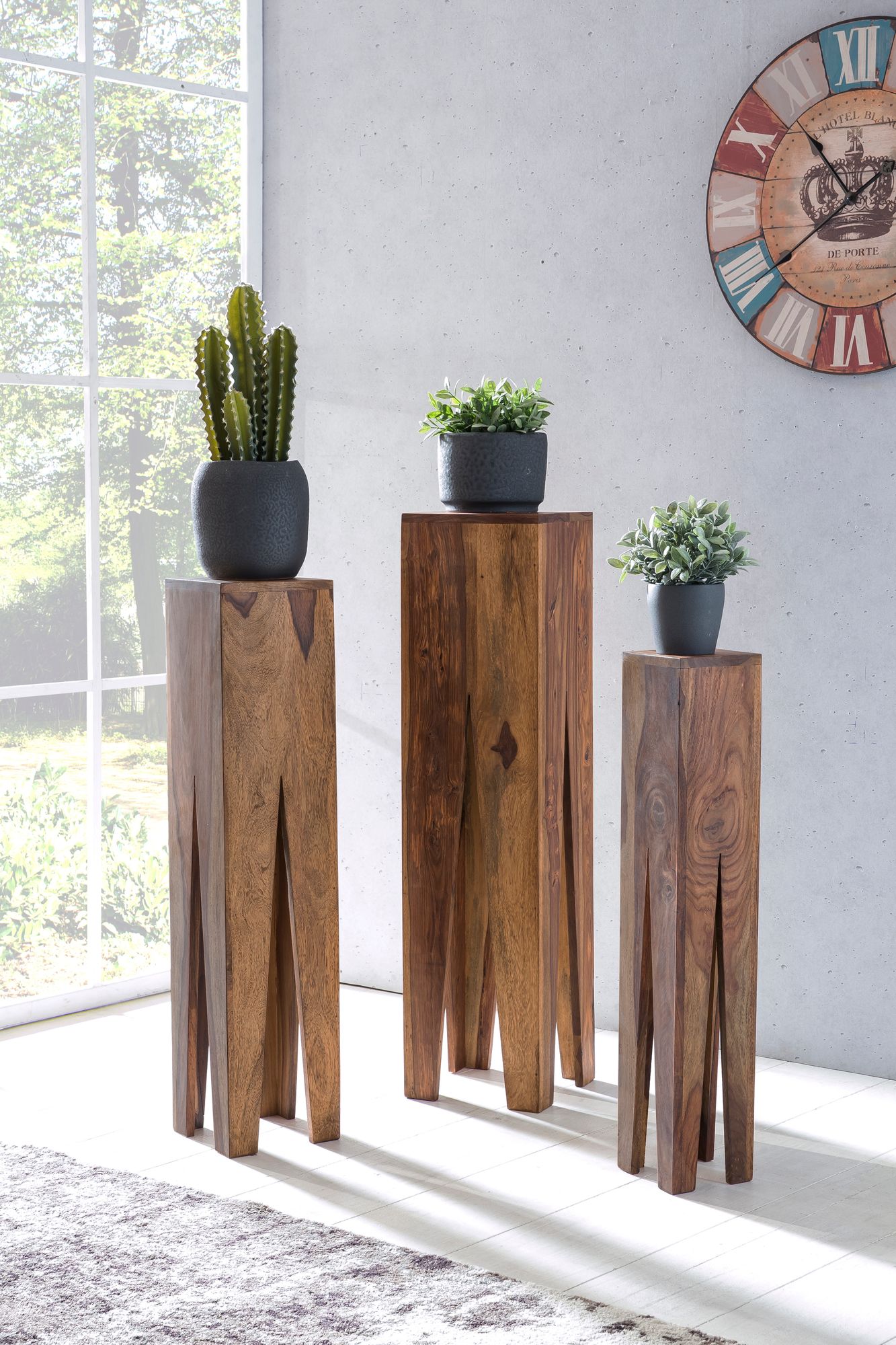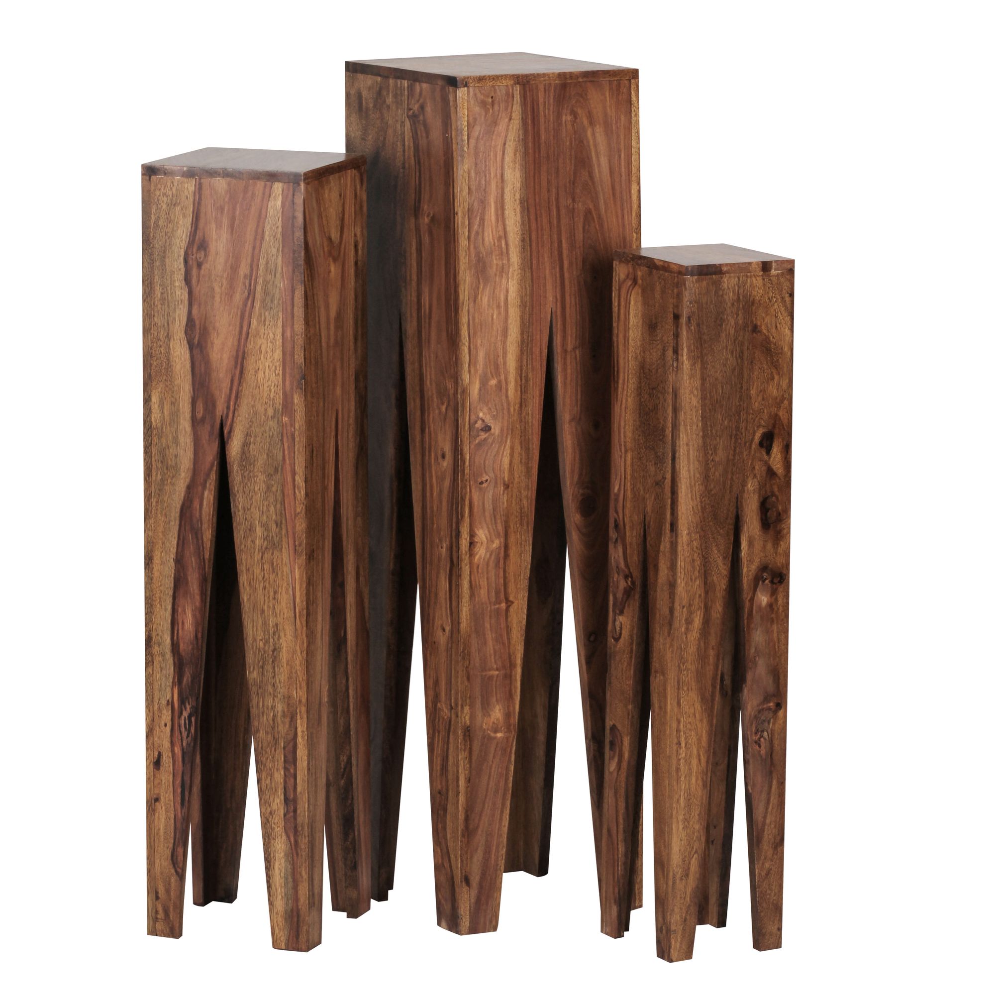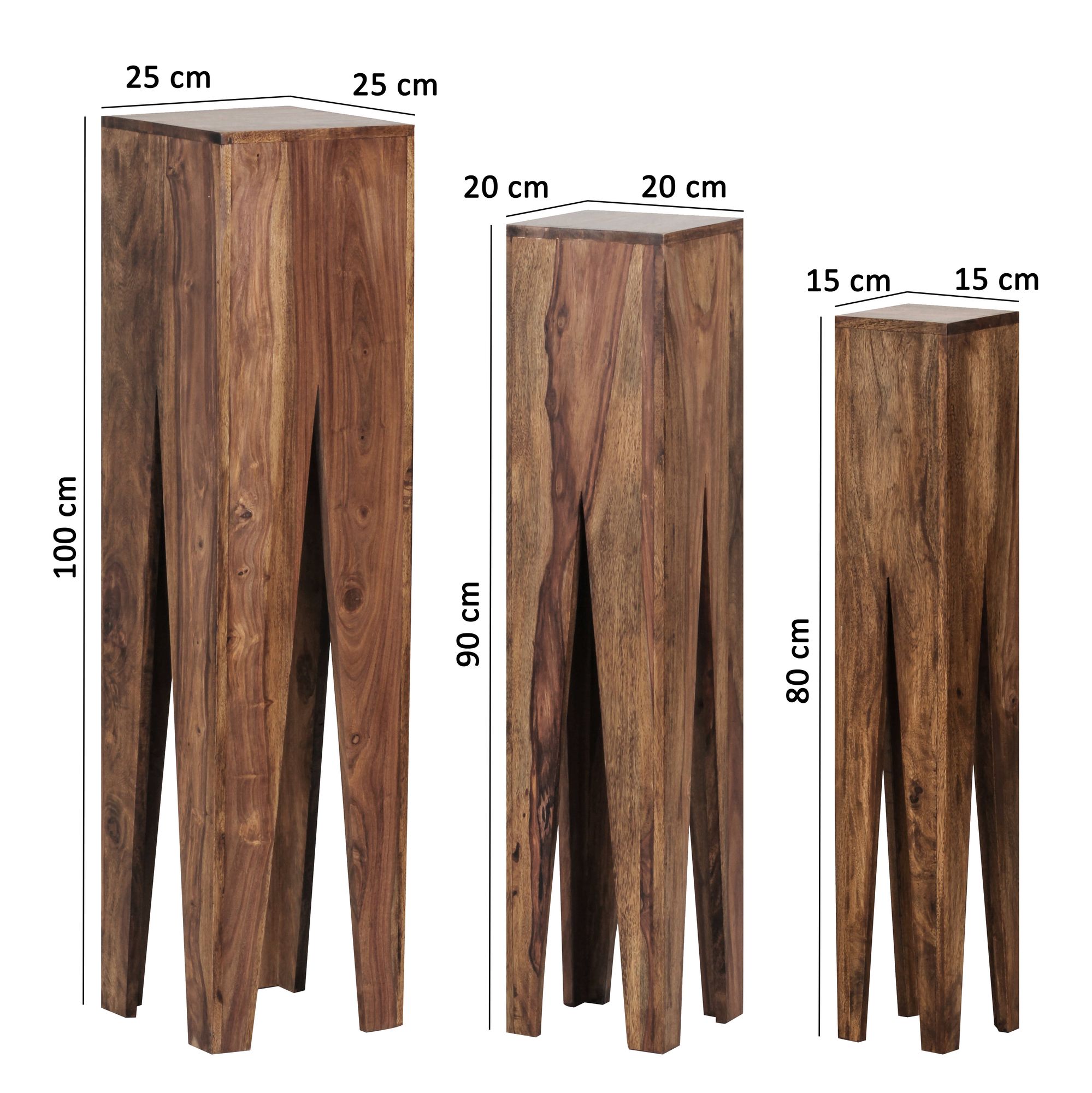 Sada 3 přístavních stolků z masivního dřeva Sheesham hnědé barvy kombinuje funkčnost a moderní čtvercový design se sloupovými nohami. Ideální pro vystavení dekorativních předmětů, každý stolek je jedinečný ručně vyrobený kus.