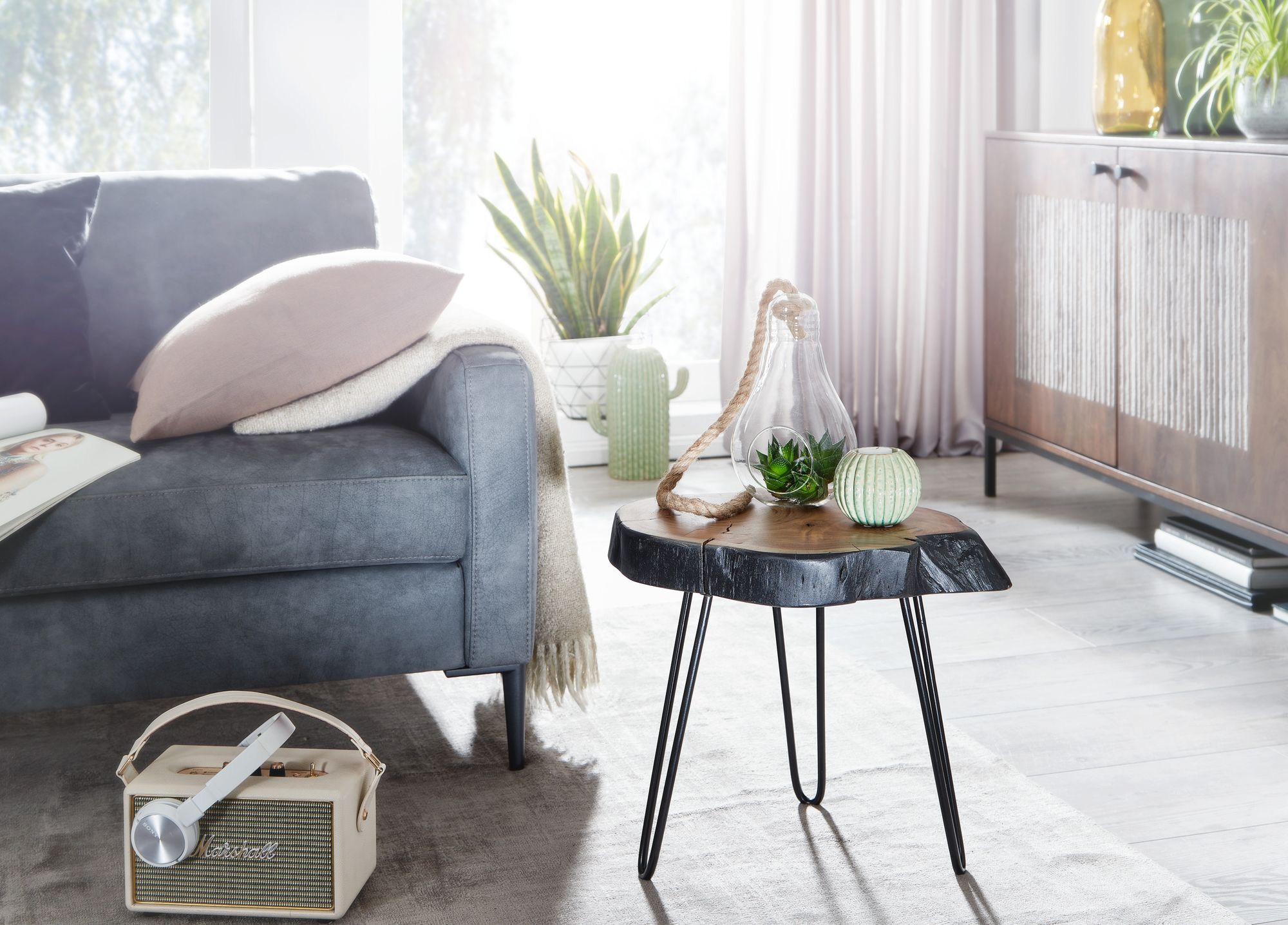 Vneste do svého interiéru industriální a přírodní nádech s tímto ručně vyráběným odkládacím stolkem z masivního akátového dřeva a kovu. Silná deska o tloušťce 6,5 cm a moderní nohy zajišťují pevnost a styl.