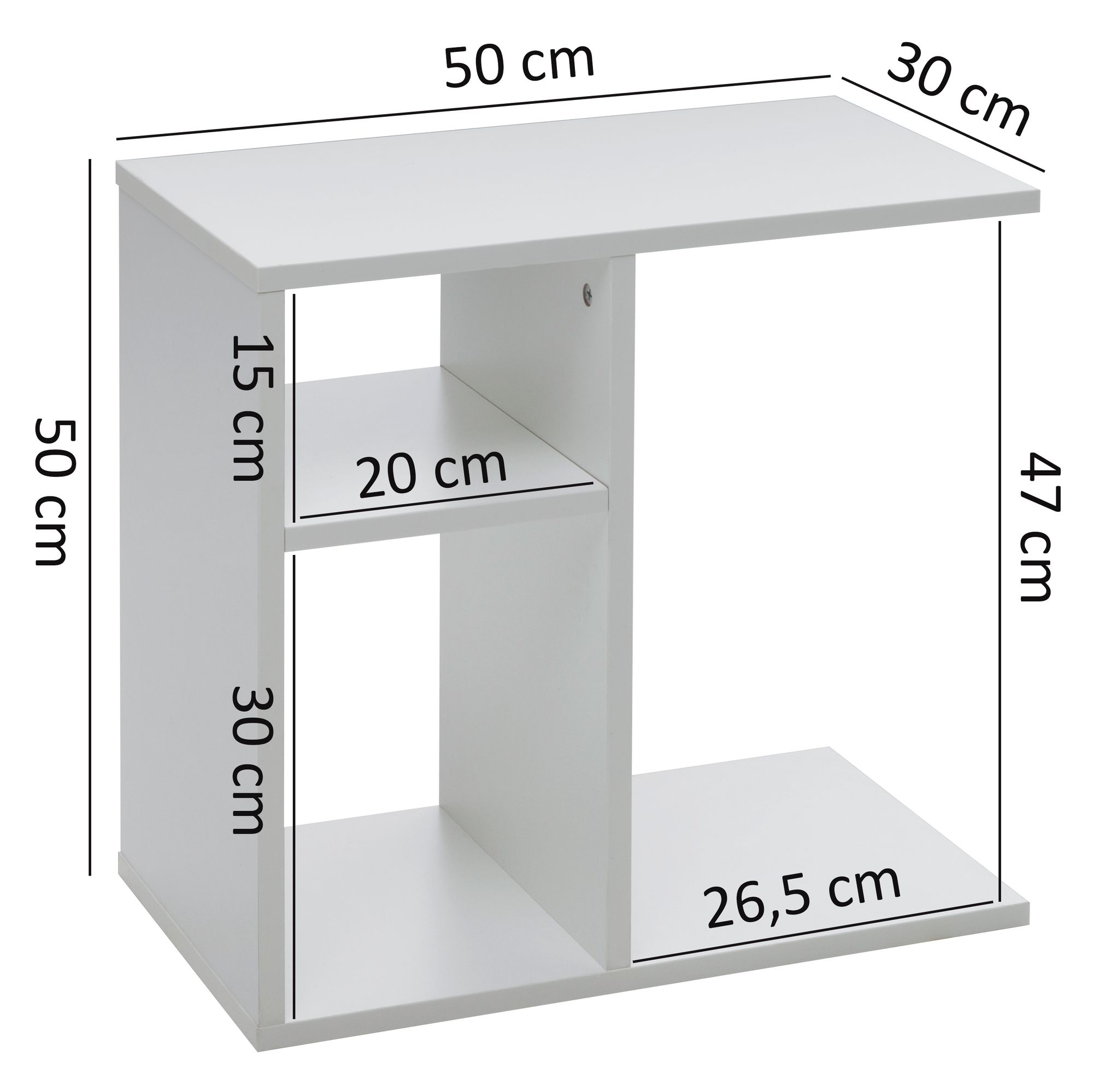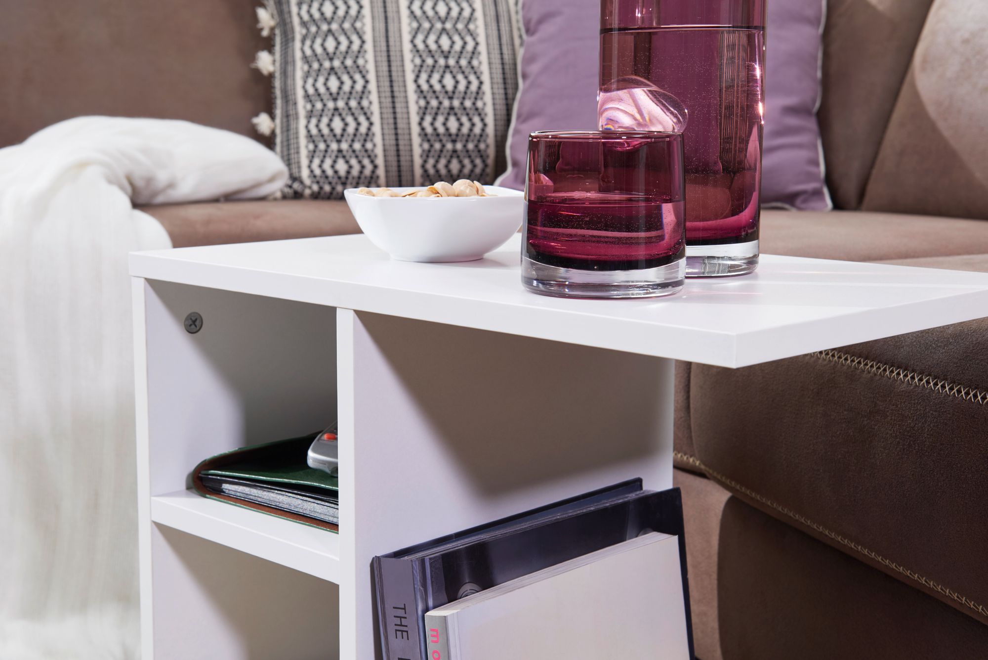 Kompaktní příruční stolek s moderním designem, ideální do obývacího pokoje. Dvě police poskytují praktický úložný prostor na dálkové ovladače a časopisy, prostorná deska poslouží pro nápoje, občerstvení a každodenní potřeby.