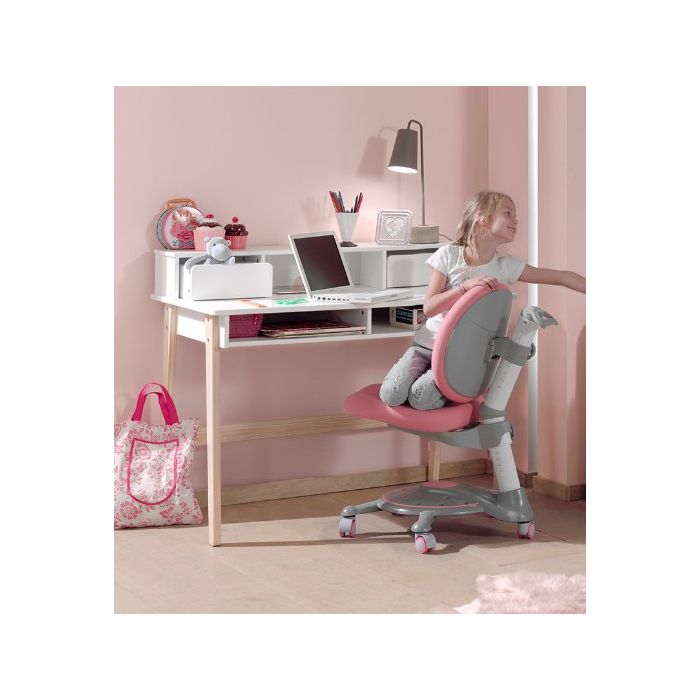 This KIDDY desk, made out of white lacquered MDF and solid pine feet, has a Scandinavian look. This desk has a large desktop, 2 open compartiments en 2 little drawers so you can easily organise your stuff.