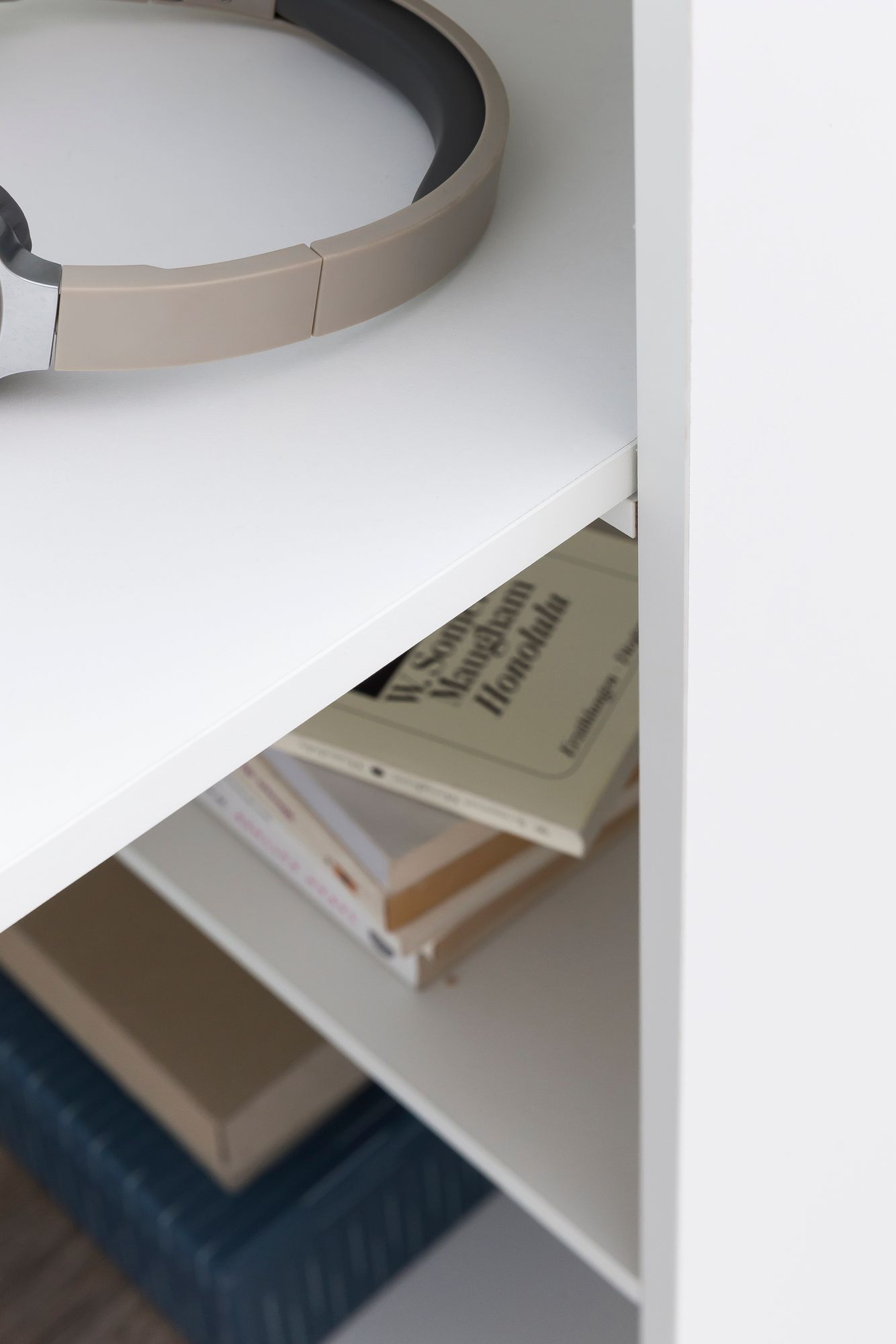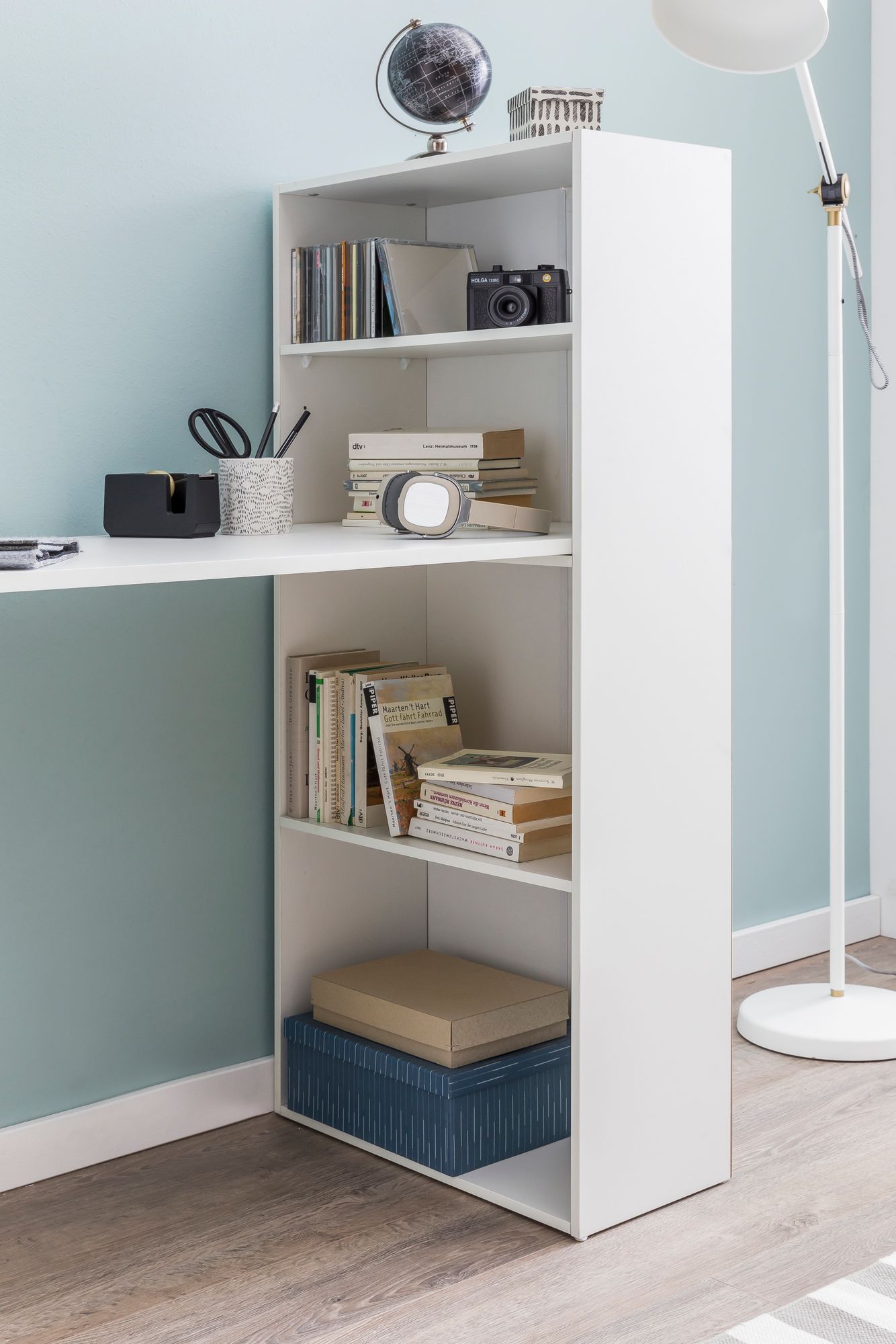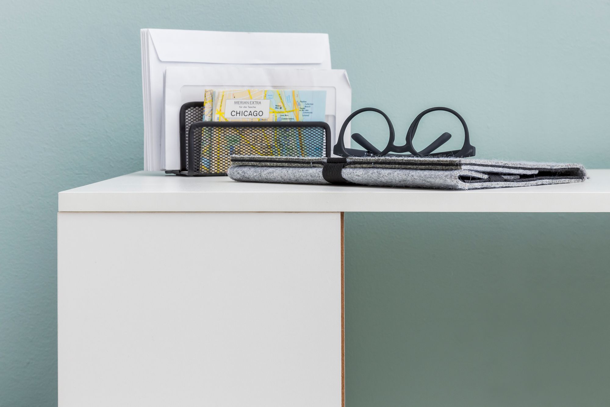 Moderní psací stůl s bílou matnou policí z dřevotřísky nabízí praktický úložný prostor pro složky a kancelářské potřeby.