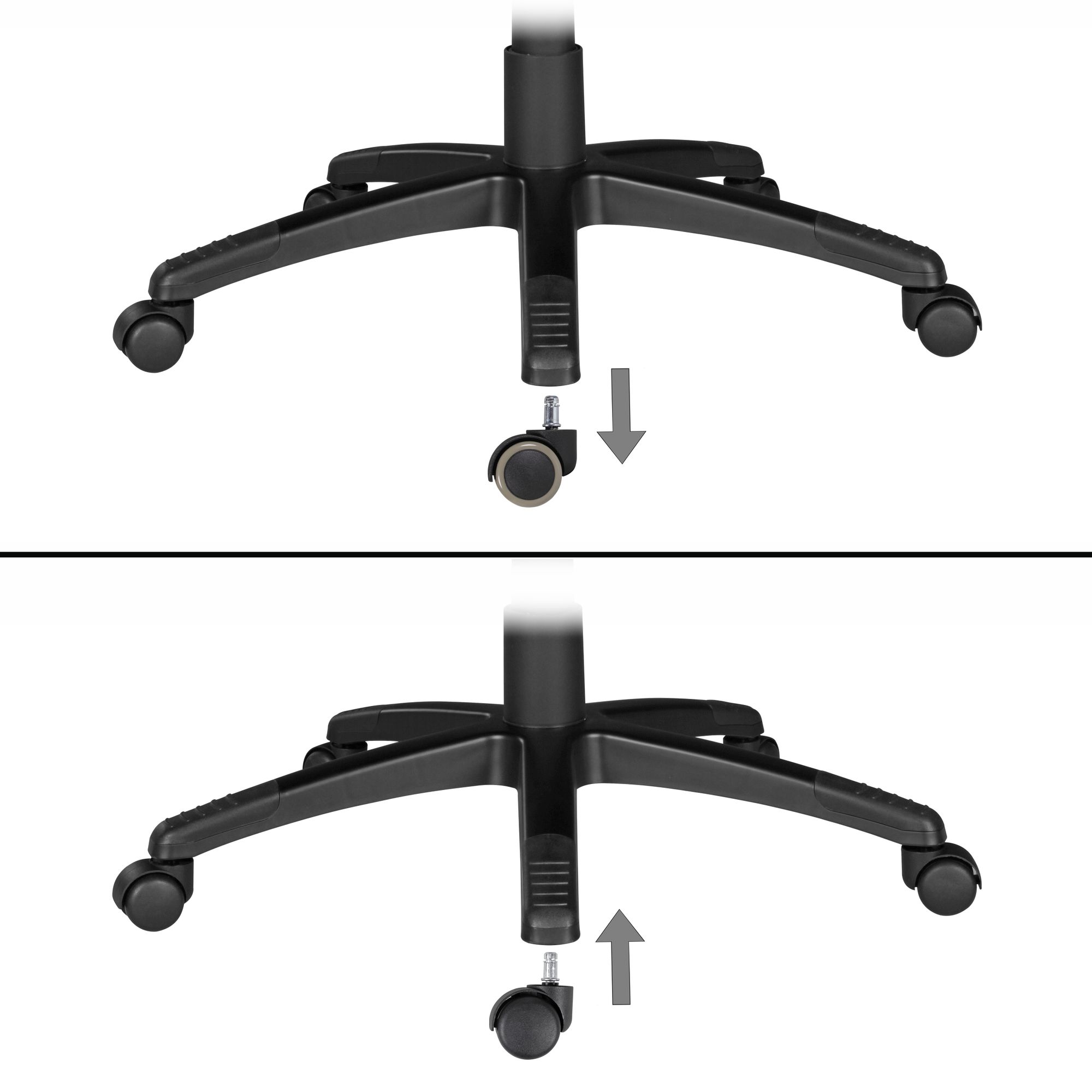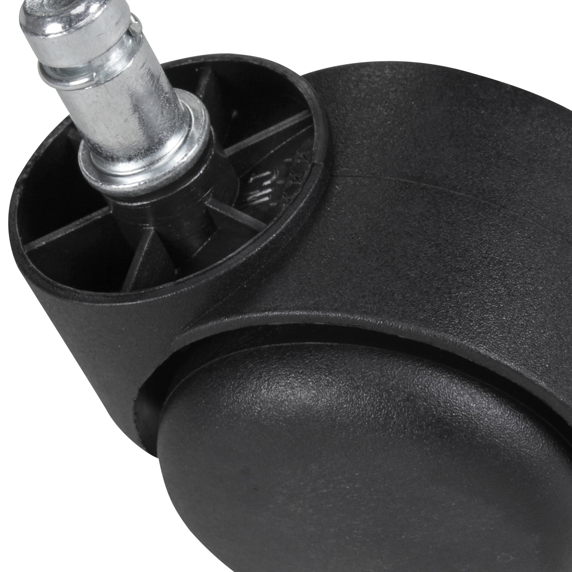Sada 5 brzděných koleček z černého polyuretanu, vhodných pro kancelářská křesla s čepem o průměru 11 mm. Průměr koleček je 50 mm, poskytuje hladký a kontrolovaný pohyb na kobercových a filcových podlahách.