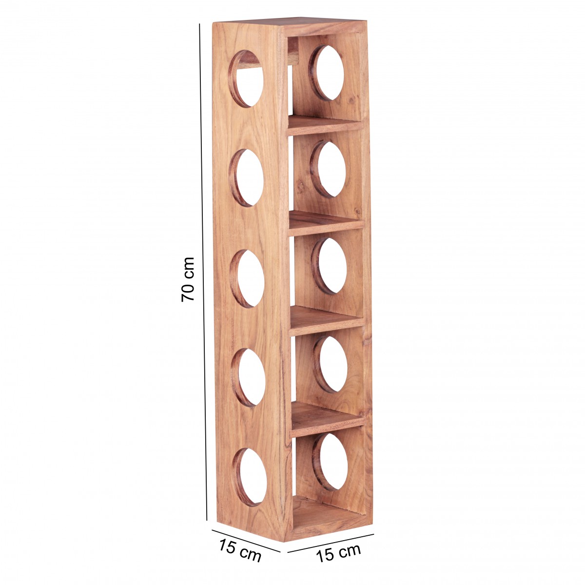 Věšák na víno MUMBAI z přírodního masivního akáciového dřeva je moderním a praktickým řešením pro skladování lahví. Určen k montáži na stěnu, obsahuje 5 přihrádek s otvory pro přibližně 5 lahví vína.