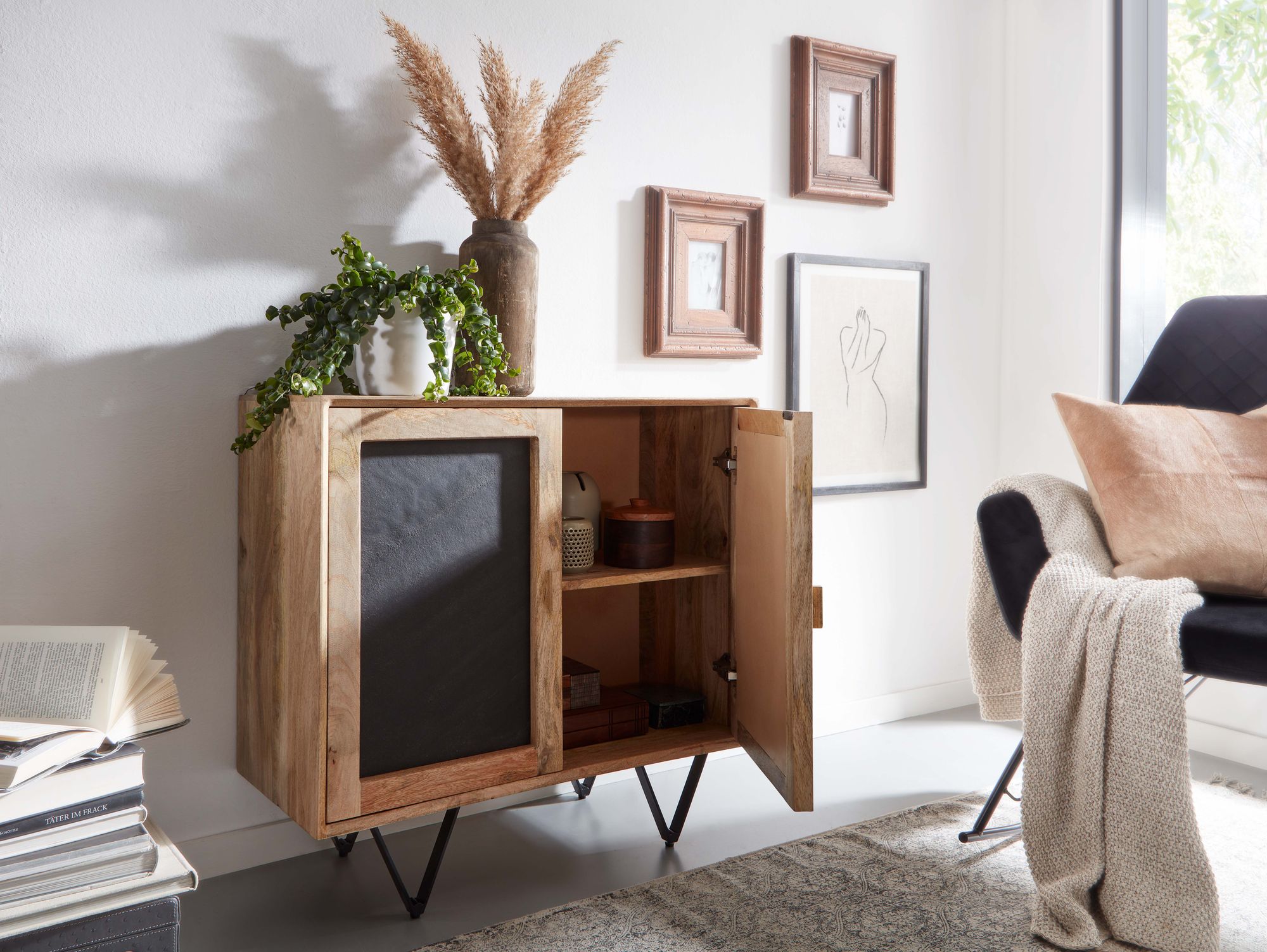 Stylová komoda, která kombinuje teplo masivního manga dřeva s moderním designem a antracitovými dveřmi s kameným vzhledem. Ideální pro optimalizaci prostoru, nabízí dva úložné prostory s magnetickými dveřmi a velkou odkládací plochu.