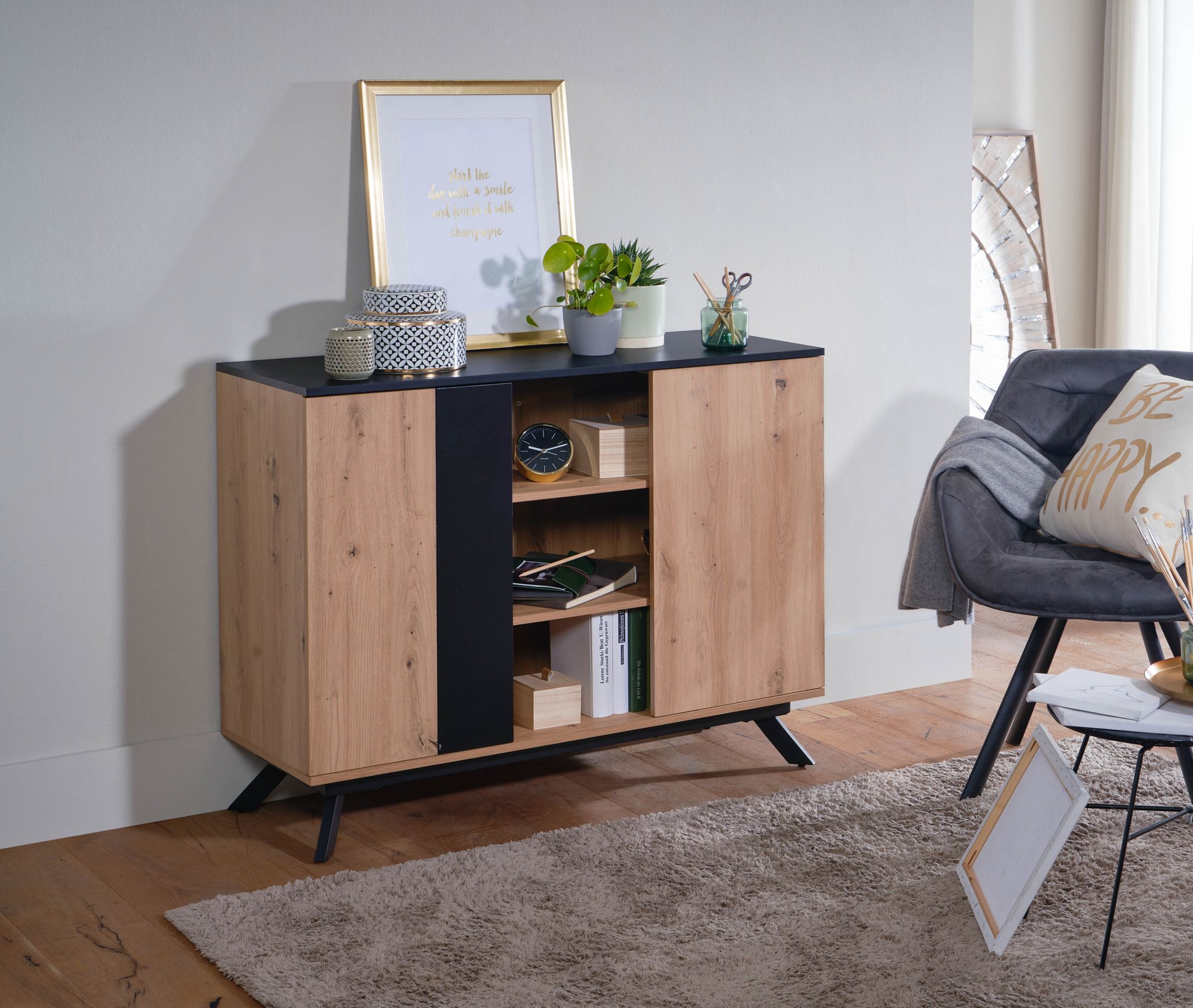 - Harmonická kombinace dubového dekoru a černé